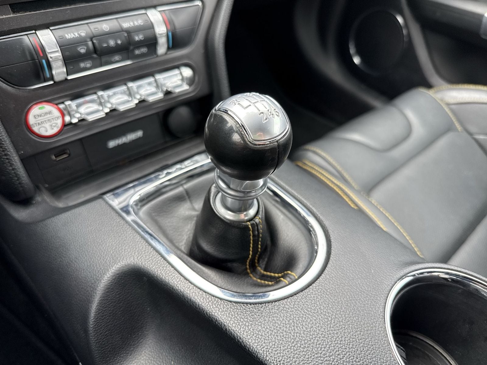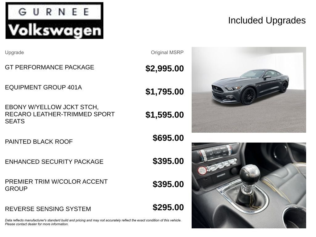 With options like Enhanced Security Package (Active Anti-Theft System and Wheel Locking Kit), Equipment Group 401A (Blind Spot Info System w/Cross-Traffic Alert, HD Radio, Memory Driver Seat, Mirrors & Ambient Lighting, and Shaker Pro Audio System), GT Performance Package (3.73 TORSEN Limited-Slip Rear Axle Ratio, Engine Turn Aluminum Instrument Panel, Gauge Pack (Oil Pressure and Vacuum), HD Front Springs, Larger Brake Rotors, Larger Radiator, and Unique Stability Control), 4-Wheel Disc Brakes, 9 Speakers, ABS brakes, Air Conditioning, Alloy wheels, AM/FM radio: SiriusXM, AM/FM Stereo w/Single CD Player, Auto-dimming Rear-View mirror, Automatic temperature control, Block heater, Brake assist, Bumpers: body-color, CD player, Climate Controlled Heated/Cooled Front Seats, Compass, Delay-off headlights, Driver door bin, Driver vanity mirror, Dual front impact airbags, Dual front side impact airbags, Electronic Stability Control, Emergency communication system: 911 Assist, Exterior Parking Camera Rear, Four wheel independent suspension, Front anti-roll bar, Front Bucket Seats, Front Center Armrest, Front dual zone A/C, Front fog lights, Front reading lights, Fully automatic headlights, Garage door transmitter, Heated door mirrors, Heated front seats, High-Intensity Discharge Headlights, Illuminated entry, Knee airbag, Leather Bucket Seats, Leather Shift Knob, Low tire pressure warning, Occupant sensing airbag, Outside temperature display, Overhead airbag, Overhead console, Painted Black Roof, Panic alarm, Passenger door bin, Passenger vanity mirror, Power door mirrors, Power driver seat, Power passenger seat, Power steering, Power windows, Radio data system, Rear anti-roll bar, Rear window defroster, Remote keyless entry, Reverse Sensing System, Security system, SiriusXM Radio, Speed control, Speed-sensing steering, Speed-Sensitive Wipers, Split folding rear seat, Steering wheel mounted audio controls, SYNC 3 Communications & Entertainment System, Tachometer, Telescoping steering wheel, Tilt steering wheel, Traction control, Trip computer, Turn signal indicator mirrors, Variably intermittent wipers, Ventilated front seats, Voltmeter, and Wheels: 18 x 8 Magnetic Painted/Machined.