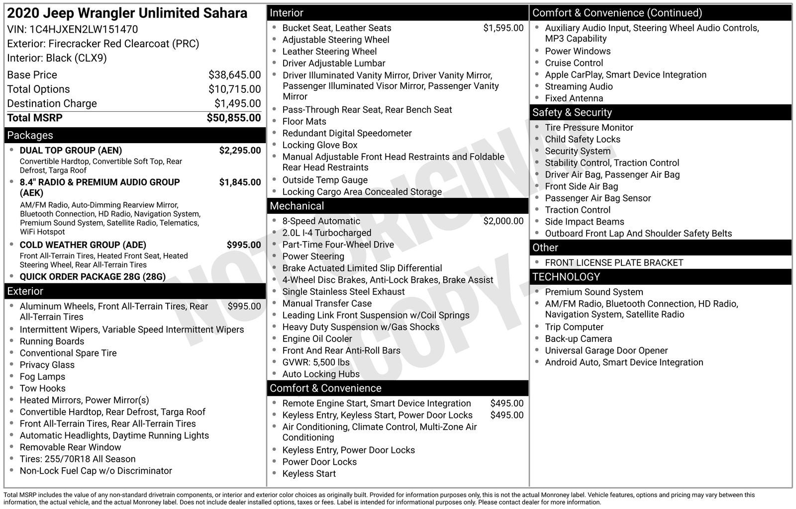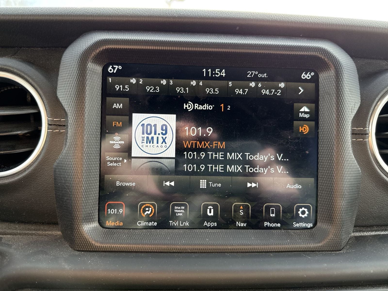 With options like 8.4 Radio & Premium Audio Group (1-Year SiriusXM Guardian Trial, 4G LTE Wi-Fi Hot Spot, 5-Year SiriusXM Traffic Service, 5-Year SiriusXM Travel Link Service, 8.4 Touchscreen Display, Alpine Premium Audio System, Auto-Dimming Rear-View Mirror, Emergency/Assistance Call, For Details, Visit DriveUconnect.com, GPS Navigation, HD Radio, Radio: Uconnect 4C Nav w/8.4 Display, SiriusXM Traffic Plus, and SiriusXM Travel Link), Cold Weather Group (Heated Front Seats and Heated Steering Wheel), Dual Top Group (Premium Black Sunrider Soft Top w/Dual Top Group), Quick Order Package 28G, 1-Year SiriusXM Radio Service, 3.45 Rear Axle Ratio, 4-Wheel Disc Brakes, 8 Speakers, ABS brakes, Air Conditioning, Alloy wheels, AM/FM radio: SiriusXM, Apple CarPlay, Apple CarPlay/Android Auto, Automatic temperature control, Aux Battery, Black 3-Piece Hard Top, Brake assist, Cloth Low-Back Bucket Seats, Compass, Delay-off headlights, Driver door bin, Driver vanity mirror, Dual front impact airbags, Dual front side impact airbags, Electronic Stability Control, Freedom Panel Storage Bag, Front anti-roll bar, Front Bucket Seats, Front Center Armrest w/Storage, Front dual zone A/C, Front fog lights, Front License Plate Bracket, Front reading lights, Fully automatic headlights, Garage door transmitter, Google Android Auto, GPS Antenna Input, Heated door mirrors, Heavy Duty Suspension w/Gas Shocks, Illuminated entry, Integrated roll-over protection, Integrated Voice Command w/Bluetooth®, Leather steering wheel, Low tire pressure warning, No Soft Top, Non-Lock Fuel Cap w/o Discriminator, Occupant sensing airbag, Outside temperature display, Panic alarm, ParkView Rear Back-Up Camera, Passenger door bin, Passenger vanity mirror, Power door mirrors, Power steering, Power windows, Radio data system, Radio: Uconnect 4 w/7 Display, Rear anti-roll bar, Rear reading lights, Rear Window Defroster, Rear Window Wiper/Washer, Remote keyless entry, Remote Proximity Keyless Entry, Remote Start System, Security system, Speed control, Split folding rear seat, Steering wheel mounted audio controls, Stop-Start Dual Battery System, Tachometer, Telescoping steering wheel, Tilt steering wheel, Traction control, Trip computer, Variably intermittent wipers, Voltmeter, Wheels: 18 x 7.5 Polished w/Gray Spokes, and Wheels: 18 x 7.5 Tech Gray Polished FacE.