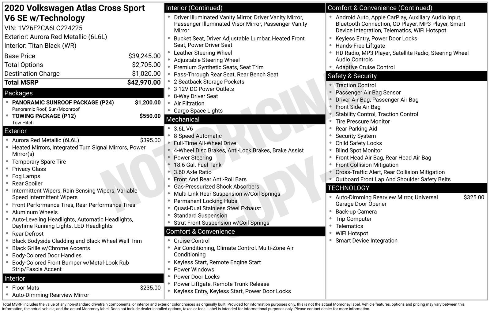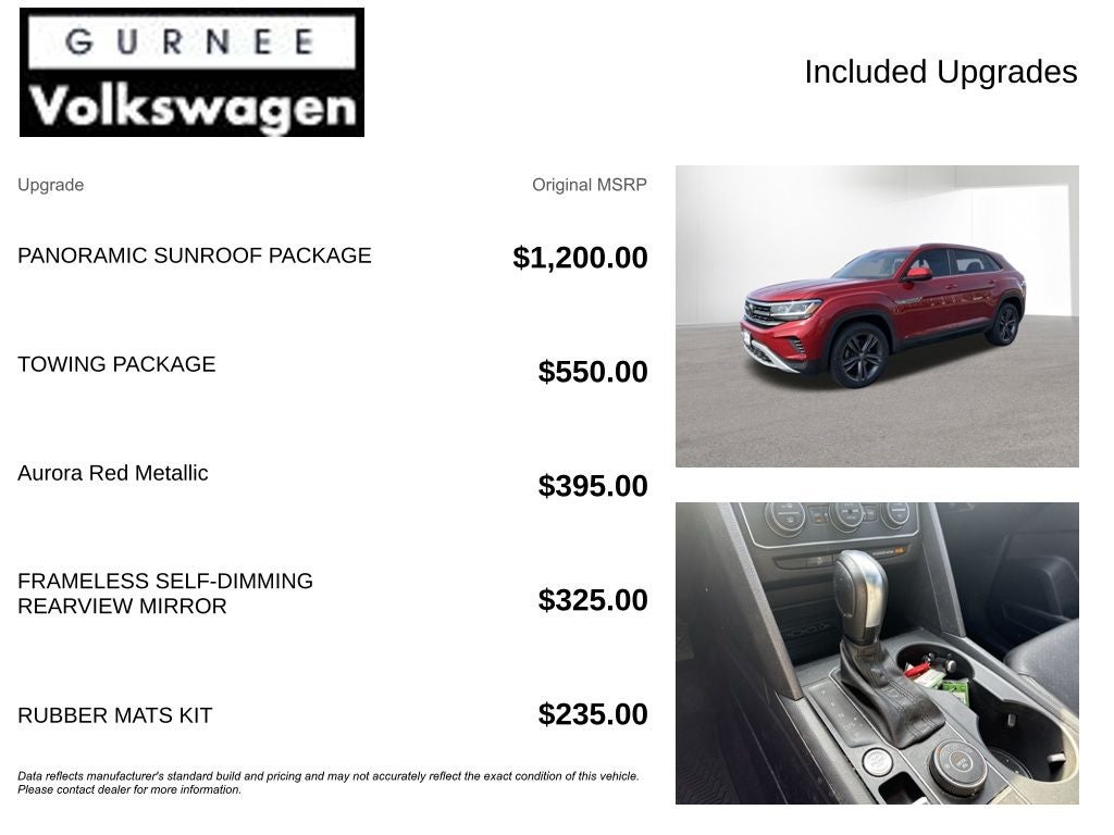 With options like Panoramic Sunroof Package (Power Tilting & Sliding Panoramic Sunroof), Towing Package, 3.60 Axle Ratio, 4-Wheel Disc Brakes, 6 Speakers, ABS brakes, Air Conditioning, Alloy wheels, AM/FM radio: SiriusXM, Auto-dimming Rear-View mirror, Automatic temperature control, Brake assist, Bumpers: body-color, Compass, Delay-off headlights, Driver door bin, Driver vanity mirror, Dual front impact airbags, Dual front side impact airbags, Electronic Stability Control, Emergency communication system: VW Car-Net services (capabilities require enrollment or subscription), Exterior Parking Camera Rear, Four wheel independent suspension, Frameless Self-Dimming Rearview Mirror, Front anti-roll bar, Front Bucket Seats, Front Center Armrest, Front dual zone A/C, Front fog lights, Front reading lights, Fully automatic headlights, Heated Comfort Front Bucket Seats, Heated door mirrors, Heated front seats, Heavy Duty Trunk Liner w/VW CarGo Blocks, Illuminated entry, Leather Shift Knob, Low tire pressure warning, Occupant sensing airbag, Outside temperature display, Overhead airbag, Overhead console, Panic alarm, Passenger door bin, Passenger vanity mirror, Power door mirrors, Power driver seat, Power Liftgate, Power steering, Power windows, Radio data system, Radio: Composition Media w/8.0 Touchscreen, Rain sensing wipers, Rear anti-roll bar, Rear reading lights, Rear seat center armrest, Rear window defroster, Rear window wiper, Remote CD player, Remote keyless entry, Roof rack: rails only, Rubber Mats Kit, Security system, Speed control, Speed-sensing steering, Split folding rear seat, Spoiler, Standard Suspension, Steering wheel mounted audio controls, Tachometer, Telescoping steering wheel, Tilt steering wheel, Traction control, Trip computer, Turn signal indicator mirrors, V-Tex Leatherette Seating Surfaces, Variably intermittent wipers, VW App-Connect (w/Apple CarPlay, Android Auto & MirrorLink), and Wheels: 20 5-Spoke Silver Alloy (CQ0)