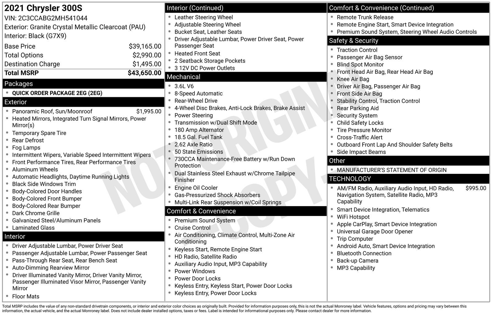 With options like Quick Order Package 2EG, 1-Year SiriusXM Guardian Trial, 2-Piece Shark Fin Antenna, 4-Wheel Disc Brakes, 4G LTE Wi-Fi Hot Spot, 5-Year SiriusXM Traffic Service, 5-Year SiriusXM Travel Link Service, 6 Speakers, 8.4 Touchscreen Display, ABS brakes, Air Conditioning, Alloy wheels, AM/FM radio: SiriusXM, Anti-whiplash front head restraints, Apple CarPlay, Apple CarPlay/Android Auto, Auto-dimming door mirrors, Auto-dimming Rear-View mirror, Automatic temperature control, Brake assist, Bumpers: body-color, Compass, Delay-off headlights, Driver door bin, Driver vanity mirror, Dual front impact airbags, Dual front side impact airbags, Dual-Pane Panoramic Sunroof, Electronic Stability Control, Emergency communication system: SiriusXM Guardian, For Details Visit DriveUconnect.com, Four wheel independent suspension, Front anti-roll bar, Front Bucket Seats, Front Center Armrest, Front dual zone A/C, Front fog lights, Front License Plate Bracket, Front reading lights, Fully automatic headlights, Garage door transmitter, Google Android Auto, GPS Antenna Input, GPS Navigation, HD Radio, Heated door mirrors, Heated front seats, Illuminated entry, Integrated Voice Command w/Bluetooth®, Knee airbag, Leather Trimmed Sport Seats, Low tire pressure warning, Media Hub (2 USB, AUX), Occupant sensing airbag, Outside temperature display, Overhead airbag, Overhead console, Panic alarm, ParkView Rear Back-Up Camera, Passenger door bin, Passenger vanity mirror, Power door mirrors, Power driver seat, Power passenger seat, Power steering, Power windows, Radio data system, Radio: Uconnect 4C Nav w/8.4 Display, Radio: Uconnect 4C w/8.4 Display, Rear anti-roll bar, Rear reading lights, Rear seat center armrest, Rear window defroster, Remote keyless entry, Security system, SiriusXM Satellite Radio, SiriusXM Traffic Plus, SiriusXM Travel Link, Speed control, Speed-sensing steering, Speed-Sensitive Wipers, Split folding rear seat, Steering wheel mounted audio controls, Tachometer, Telescoping steering wheel, Tilt steering wheel, Traction control, Trip computer, Turn signal indicator mirrors, USB Host Flip, Variably intermittent wipers, and Wheels: 20 x 8.0 Black Noise AluminuM.
