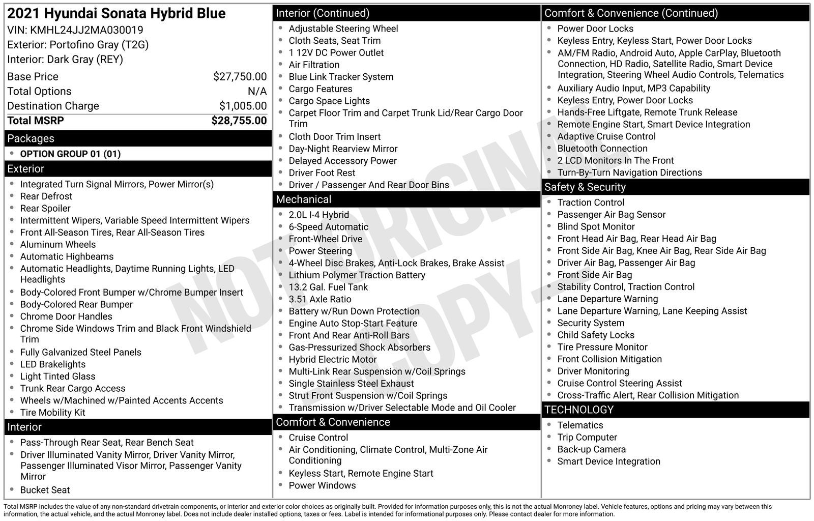 With options like Option Group 01, 16 x 6.5J Aluminum Alloy Wheels, 4-Wheel Disc Brakes, 6 Speakers, ABS brakes, Air Conditioning, Alloy wheels, AM/FM radio: SiriusXM, Apple CarPlay & Android Auto, Auto High-beam Headlights, Automatic temperature control, Brake assist, Bumpers: body-color, Carpeted Floor Mats, Delay-off headlights, Driver door bin, Driver vanity mirror, Dual front impact airbags, Dual front side impact airbags, Electronic Stability Control, Emergency communication system: Blue Link Connected Car Service (3-year complimentary subscription), Four wheel independent suspension, Front anti-roll bar, Front Bucket Seats, Front Center Armrest, Front dual zone A/C, Front reading lights, Fully automatic headlights, Illuminated entry, Knee airbag, Low tire pressure warning, Occupant sensing airbag, Outside temperature display, Overhead airbag, Overhead console, Panic alarm, Passenger door bin, Passenger vanity mirror, Power door mirrors, Power steering, Power windows, Premium Cloth Seating Surfaces, Radio data system, Radio: AM/FM/SiriusXM/MP3 Display Audio, Rear anti-roll bar, Rear side impact airbag, Rear window defroster, Remote keyless entry, Security system, Speed control, Speed-sensing steering, Speed-Sensitive Wipers, Split folding rear seat, Spoiler, Steering wheel mounted audio controls, Telescoping steering wheel, Tilt steering wheel, Traction control, Trip computer, Turn signal indicator mirrors, and Variably intermittent wipers.