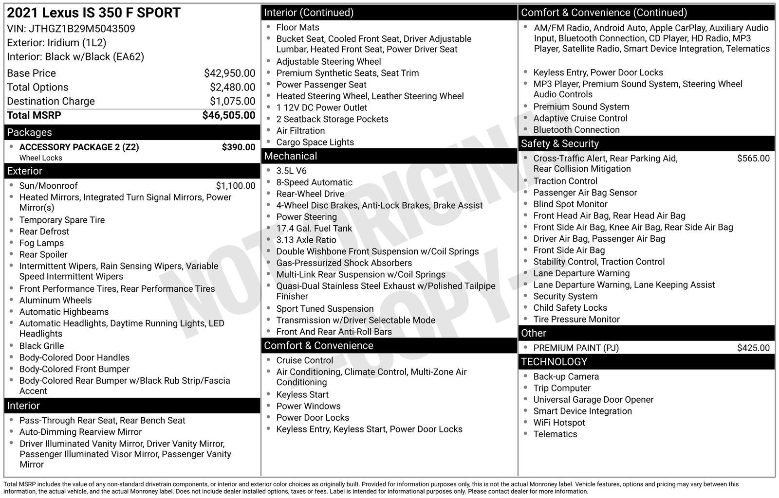 With options like 10 Speakers, 4-Wheel Disc Brakes, ABS brakes, Air Conditioning, Alloy wheels, AM/FM radio: SiriusXM, AM/FM/CD Player, Apple CarPlay/Android Auto, Auto High-beam Headlights, Auto-dimming door mirrors, Auto-dimming Rear-View mirror, Automatic temperature control, Brake assist, Bumpers: body-color, CD player, Compass, Delay-off headlights, Driver door bin, Driver vanity mirror, Dual front impact airbags, Dual front side impact airbags, Electronic Stability Control, Emergency communication system: Lexus Enform w/Safety Connect, Exterior Parking Camera Rear, F SPORT NuLuxe Seat Trim, Four wheel independent suspension, Front anti-roll bar, Front Bucket Seats, Front Center Armrest, Front dual zone A/C, Front fog lights, Front reading lights, Fully automatic headlights, Garage door transmitter: HomeLink, Heated & Ventilated F Sport Sport Seats, Heated door mirrors, Heated front seats, Heated steering wheel, Illuminated entry, Knee airbag, Leather Shift Knob, Low tire pressure warning, Occupant sensing airbag, Outside temperature display, Overhead airbag, Overhead console, Panic alarm, Passenger door bin, Passenger vanity mirror, Power door mirrors, Power driver seat, Power passenger seat, Power steering, Power windows, Radio data system, Rain sensing wipers, Rear anti-roll bar, Rear reading lights, Rear seat center armrest, Rear side impact airbag, Rear window defroster, Remote keyless entry, Security system, Speed control, Speed-sensing steering, Speed-Sensitive Wipers, Split folding rear seat, Spoiler, Sport steering wheel, Steering wheel mounted audio controls, Tachometer, Telescoping steering wheel, Tilt steering wheel, Traction control, Trip computer, Turn signal indicator mirrors, Variably intermittent wipers, Ventilated front seats, and Wheels: 19 x 8.5J Front & 19 x 9.5J Rear.