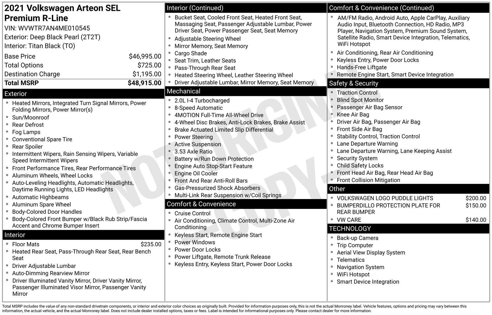 With options like 12 Speakers, 4-Wheel Disc Brakes, ABS brakes, Adaptive suspension, Air Conditioning, Alloy wheels, AM/FM radio: SiriusXM with 360L, Auto High-beam Headlights, Auto-dimming door mirrors, Auto-dimming Rear-View mirror, Automatic temperature control, Brake assist, Bumpers: body-color, Compass, Delay-off headlights, Driver door bin, Driver vanity mirror, Dual front impact airbags, Dual front side impact airbags, Electronic Stability Control, Emergency communication system: VW Car-Net Safe & Secure 5-year, Four wheel independent suspension, Front anti-roll bar, Front Bucket Seats, Front Center Armrest, Front dual zone A/C, Front fog lights, Front reading lights, Fully automatic headlights, harman/kardon® Speakers, Heated door mirrors, Heated Front Comfort Sport Seats, Heated front seats, Heated rear seats, Heated steering wheel, Illuminated entry, Knee airbag, Leather Shift Knob, Leather steering wheel, Low tire pressure warning, Memory seat, Occupant sensing airbag, Outside temperature display, Overhead airbag, Overhead console, Panic alarm, Passed Multipoint inspection, Passenger door bin, Passenger vanity mirror, Perforated Nappa Leather Seating Surfaces, Power door mirrors, Power driver seat, Power Liftgate, Power moonroof, Power passenger seat, Power steering, Power windows, Radio data system, Radio: MIB3 Discover Media Navigation AM/FM/HD, Rain sensing wipers, Rear air conditioning, Rear anti-roll bar, Rear reading lights, Rear seat center armrest, Rear window defroster, Remote keyless entry, Security system, Speed control, Speed-sensing steering, Split folding rear seat, Spoiler, Sport steering wheel, Steering wheel mounted audio controls, Tachometer, Telescoping steering wheel, Tilt steering wheel, Traction control, Trip computer, Turn signal indicator mirrors, Variably intermittent wipers, Ventilated front seats, and Wheels: 20 2-Tone Machined Alloy.