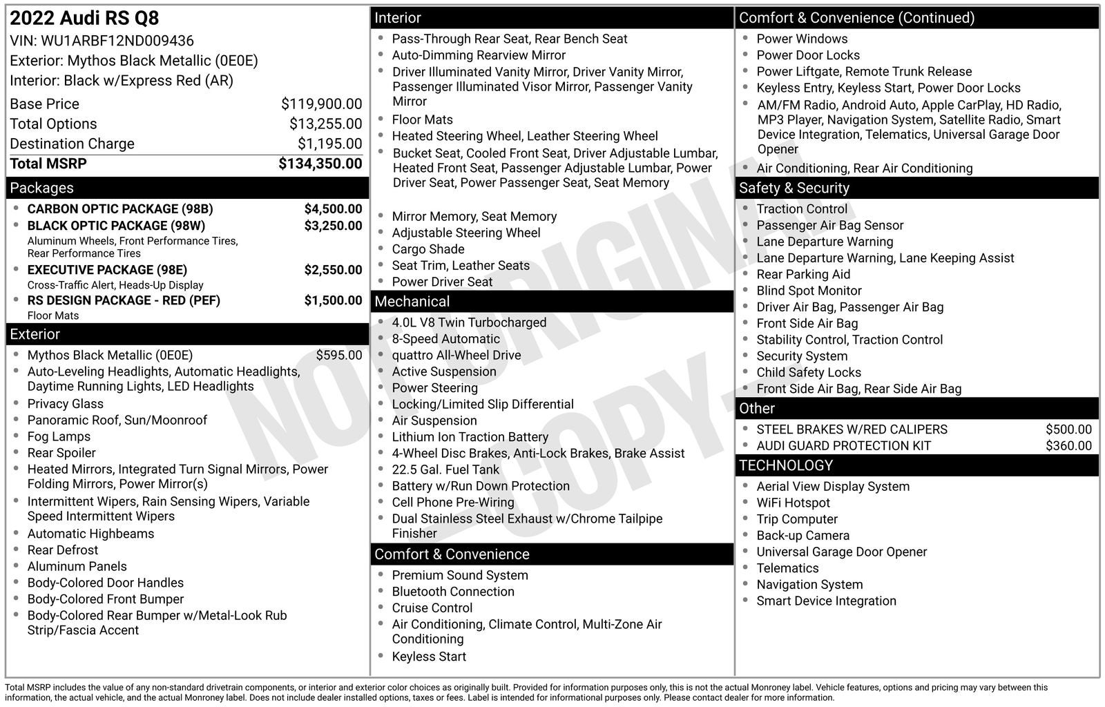 With options like Black Optic Package (Black Mirror Housings, Black Roof Rails, Sport Exhaust System w/Black Tips, and Wheels: 23 Audi Sport 5 Y-Spoke Rotor Design), Carbon Optic Package (Carbon Mask & Front Bumper Inlays, Carbon Mirror Housings, Carbon Rear Bumper Inlay, and Carbon Rear Lighting Strip), Executive Package (Dual-Pane Acoustic Glass, Head-Up Display, Intersection Assist, and Power Soft-Closing Doors), Leather Package, RS Design Package - Red (Alcantara Covered Steering Wheel, Black Seat Belts w/Red Edge, Red Contrast Stitching, and RS Logo Floor Mats w/Red Contrast Stitching), 17 Speakers, 4-Wheel Disc Brakes, ABS brakes, Adaptive suspension, Air Conditioning, All-Weather Floor Mats, Alloy wheels, AM/FM radio: SiriusXM, Audi smartphone interface (Apple CarPlay/Android Auto), Auto High-beam Headlights, Auto-dimming door mirrors, Auto-dimming Rear-View mirror, Auto-leveling suspension, Automatic temperature control, Bang & Olufsen 3D Premium Sound System, Brake assist, Bumpers: body-color, Cargo Mat, Compass, Delay-off headlights, Driver door bin, Driver vanity mirror, Dual front impact airbags, Dual front side impact airbags, Electronic Stability Control, Emergency communication system: Audi connect CARE, PRIME & PLUS, Exterior Parking Camera Rear, Four wheel independent suspension, Front anti-roll bar, Front Bucket Seats, Front Center Armrest, Front dual zone A/C, Front fog lights, Front reading lights, Fully automatic headlights, Garage door transmitter: HomeLink, Heated & Ventilated Front S Sport Seats, Heated door mirrors, Heated front seats, Heated steering wheel, Illuminated entry, Leather Shift Knob, Leather steering wheel, Low tire pressure warning, Memory seat, Navigation system: Audi MMI Navigation plus with Touch Response, Occupant sensing airbag, Outside temperature display, Overhead airbag, Overhead console, Panic alarm, Passenger door bin, Passenger vanity mirror, Perforated Valcona Leather Seating Surfaces, Power door mirrors, Power driver seat, Power Liftgate, Power moonroof: Panoramic, Power passenger seat, Power steering, Power windows, Radio data system, Radio: MMI Navigation Plus w/MMI Touch Response, Rain sensing wipers, Rear air conditioning, Rear anti-roll bar, Rear dual zone A/C, Rear fog lights, Rear reading lights, Rear seat center armrest, Rear side impact airbag, Rear window defroster, Rear window wiper, Remote keyless entry, Roof rack: rails only, Security system, Speed control, Speed-sensing steering, Split folding rear seat, Spoiler, Steel Brakes w/Red Calipers, Steering wheel memory, Steering wheel mounted audio controls, Tachometer, TBD Axle Ratio, Telescoping steering wheel, Tilt steering wheel, Traction control, Trip computer, Turn signal indicator mirrors, Variably intermittent wipers, Ventilated front seats, and Wheels: 22 10-V-Spoke Star Design.