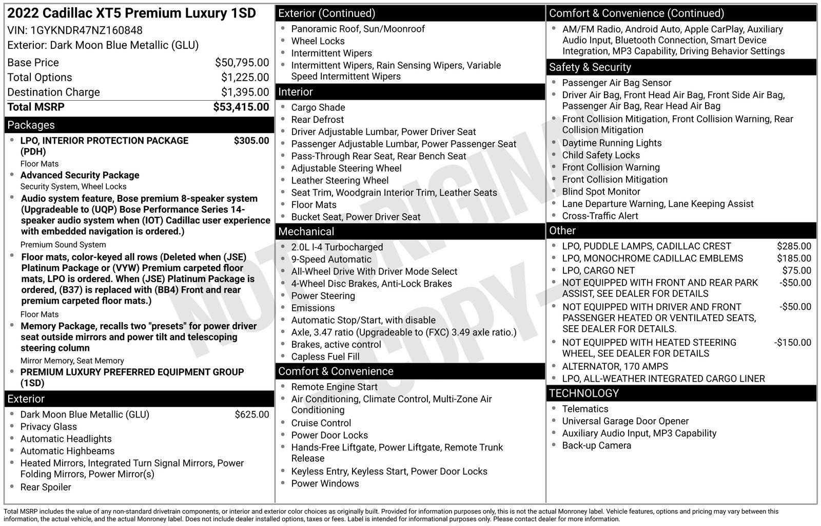 With options like Interior Protection Package (LPO) (All-Weather Floor Mats and All-Weather Integrated Cargo Liner (LPO)), Premium Luxury Package 1SD (Automatic Dual-Zone Climate Control, Automatic Emergency Braking, Dual Driver Info Center Display Gauge Cluster, Front & Rear Park Assist, HD Rear Vision Camera, Inside Rear-View Auto-Dimming Mirror, and Teen Driver), 170 Amp Alternator, 2-Way Power Driver Lumbar Control Seat Adjuster, 2-Way Power Passenger Lumbar Control Seat Adjuster, 3.47 Axle Ratio, 4-Wheel Disc Brakes, 4-Wheel Independent Suspension, 8 Speakers, ABS brakes, Air Conditioning, Alloy wheels, AM/FM radio: SiriusXM, Apple CarPlay/Android Auto, Audio memory, Auto High-beam Headlights, Auto-dimming door mirrors, Auto-dimming Rear-View mirror, Automatic Heated Steering Wheel, Automatic Stop/Start w/Disable, Automatic temperature control, Bodyside moldings, Bose Premium 8-Speaker Audio System Feature, Brake assist, Bumpers: body-color, Cargo Net, Compass, Delay-off headlights, Driver door bin, Driver vanity mirror, Dual front impact airbags, Dual front side impact airbags, Electronic Stability Control, Emergency communication system: OnStar and Cadillac connected services capable, Four wheel independent suspension, Front anti-roll bar, Front Bucket Seats, Front Center Armrest, Front dual zone A/C, Front reading lights, Fully automatic headlights, Garage door transmitter, Heated door mirrors, Heated Driver & Front Passenger Seats, Heated front seats, Heated steering wheel, Illuminated entry, Knee airbag, Leather Seating Surfaces w/Mini Perforated Inserts, Leather steering wheel, Low tire pressure warning, Memory seat, Monochrome Cadillac Emblems (LPO), Not Equipped w/Dr & Fr Pass Heated or Ventilated Seats, Not Equipped w/Front & Rear Park Assist, Not Equipped w/Heated Steering Wheel, Occupant sensing airbag, Outside temperature display, Overhead airbag, Overhead console, Panic alarm, Passenger door bin, Passenger vanity mirror, Power door mirrors, Power driver seat, Power Liftgate, Power moonroof: UltraView, Power passenger seat, Power steering, Power windows, Puddle Lamps w/Cadillac Crest (LPO), Radio data system, Radio: Cadillac User Experience AM/FM Stereo, Rain sensing wipers, Rear anti-roll bar, Rear reading lights, Rear seat center armrest, Rear window defroster, Rear window wiper, Remote keyless entry, Security system, SiriusXM w/360L, Speed control, Speed-sensing steering, Split folding rear seat, Spoiler, Steering wheel memory, Steering wheel mounted audio controls, Tachometer, Telescoping steering wheel, Tilt steering wheel, Traction control, Trip computer, Turn signal indicator mirrors, Variably intermittent wipers, Voltmeter, and Wheels: 18 6-Split Spoke Alloy.
