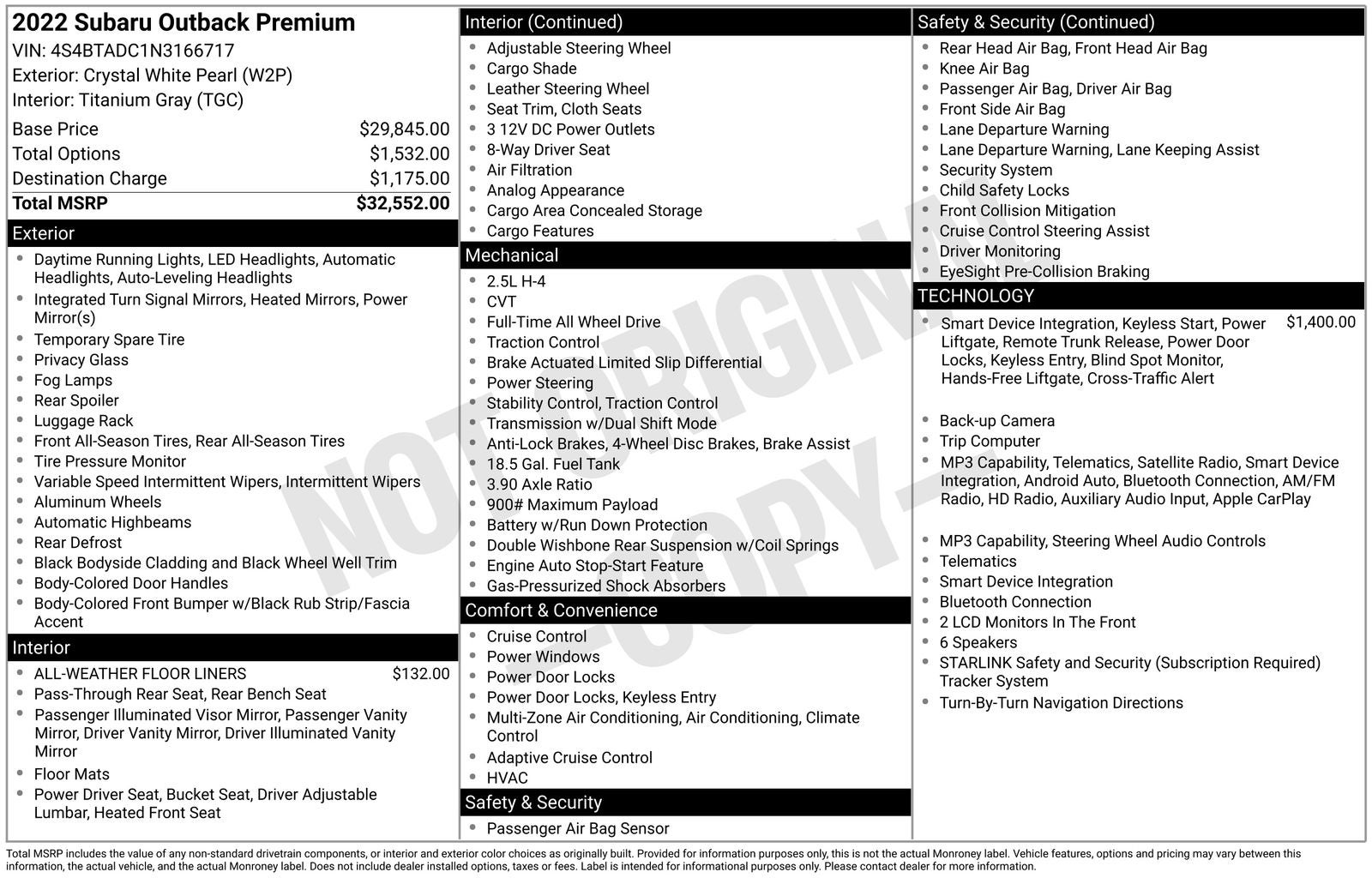With options like BSD w/RCTA & Keyless Access & Push Button Start (Blind Spot Detection (BSD), Hands-Free Power Rear Gate, Keyless Access w/Push Button Start, and Rear Cross Traffic Alert (RCTA)), 3.90 Axle Ratio, 4-Wheel Disc Brakes, 6 Speakers, ABS brakes, Air Conditioning, All-Weather Floor Liners, Alloy wheels, AM/FM radio: SiriusXM, Auto High-beam Headlights, Automatic temperature control, Brake assist, Bumpers: body-color, Cloth Upholstery, Driver door bin, Driver vanity mirror, Dual front impact airbags, Dual front side impact airbags, Electronic Stability Control, Emergency communication system: STARLINK Safety and Security (Subscription Required), Exterior Parking Camera Rear, Four wheel independent suspension, Front anti-roll bar, Front Bucket Seats, Front Center Armrest w/Storage, Front dual zone A/C, Front fog lights, Front reading lights, Fully automatic headlights, Heated door mirrors, Heated Front Bucket Seats, Heated front seats, Illuminated entry, Knee airbag, Leather steering wheel, Low tire pressure warning, Occupant sensing airbag, Outside temperature display, Overhead airbag, Overhead console, Panic alarm, Passenger door bin, Passenger vanity mirror, Power door mirrors, Power driver seat, Power steering, Power windows, Radio: Subaru STARLINK 11.6 Multimedia Plus Sys, Rear anti-roll bar, Rear seat center armrest, Rear window defroster, Rear window wiper, Remote keyless entry, Roof rack, Security system, Speed control, Speed-sensing steering, Split folding rear seat, Spoiler, STARLINK/Apple CarPlay/Android Auto, Steering wheel mounted audio controls, Steering Wheel Paddle Shift Control Switches, Tachometer, Telescoping steering wheel, Tilt steering wheel, Traction control, Trip computer, Turn signal indicator mirrors, Variably intermittent wipers, and Wheels: 17 x 7J Black Aluminum Alloy.