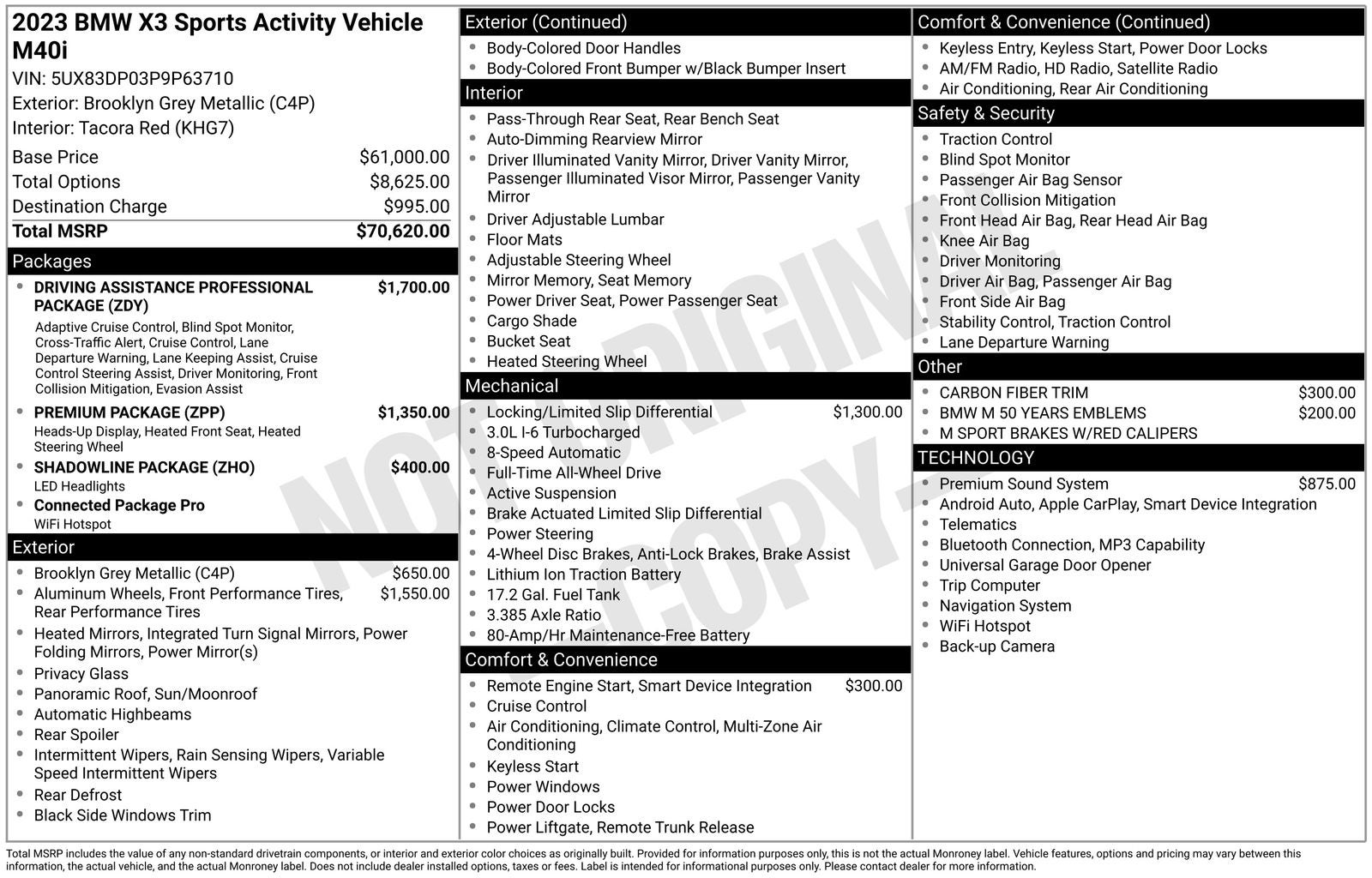 With options like Connected Package Pro, Driving Assistance Professional Package (Active Driving Assistant Pro and Extended Traffic Jam Assistant), Premium Package (Head-Up Display, Heated Front Seats, and Heated Steering Wheel), Shadowline Package (Extended Shadowline Trim and M Shadowline Lights), 12 Speakers, 3.385 Axle Ratio, 4-Wheel Disc Brakes, ABS brakes, Adaptive suspension, Air Conditioning, Alloy wheels, AM/FM Radio, AM/FM radio: SiriusXM, Apple CarPlay & Android Auto Compatibility, Auto High-beam Headlights, Auto-dimming door mirrors, Auto-dimming Rear-View mirror, Automatic temperature control, BMW Assist eCall, BMW M 50 Years Emblems, BMW TeleServices, Brake assist, Bumpers: body-color, Carbon Fiber Trim, ConnectedDrive Services, Delay-off headlights, Driver door bin, Driver Lumbar Support, Driver vanity mirror, Dual front impact airbags, Dual front side impact airbags, Electronic Stability Control, Emergency communication system: BMW Assist eCall, Enhanced USB & Bluetooth® w/Smartphone Integration, Exterior Parking Camera Rear, Four wheel independent suspension, Front anti-roll bar, Front Bucket Seats, Front Center Armrest, Front dual zone A/C, Front reading lights, Fully automatic headlights, Garage door transmitter, harman/kardon Surround Sound System, Heated door mirrors, Hi-Fi Sound System, Illuminated entry, Increased Top Speed Limiter, Knee airbag, Leather steering wheel, Live Cockpit Pro w/Navigation, Low tire pressure warning, M Sport Brakes w/Red Calipers, M Sport Differential, Memory seat, Occupant sensing airbag, Outside temperature display, Overhead airbag, Overhead console, Panic alarm, Passed Multipoint inspection, Passenger door bin, Passenger vanity mirror, Perforated SensaTec Upholstery, Power door mirrors, Power driver seat, Power Front Seats, Power Liftgate, Power moonroof, Power passenger seat, Power steering, Power windows, Radio data system, Rain sensing wipers, Rear air conditioning, Rear anti-roll bar, Rear reading lights, Rear seat center armrest, Rear window defroster, Rear window wiper, Remote Engine Start, Remote keyless entry, Security system, SiriusXM Satellite Radio, Speed control, Speed-sensing steering, Speed-Sensitive Wipers, Split folding rear seat, Spoiler, Sport Seats, Sport steering wheel, Steering wheel mounted audio controls, Tachometer, Telescoping steering wheel, Tilt steering wheel, Traction control, Trip computer, Turn signal indicator mirrors, Variably intermittent wipers, Wheels: 19 x 7.5 M Y-Spoke Bi-Color (Style 887M), Wheels: 21 x 8.5 Fr & 21 x 9.5 Rr (Style 718M), and WiFi Hotspot.